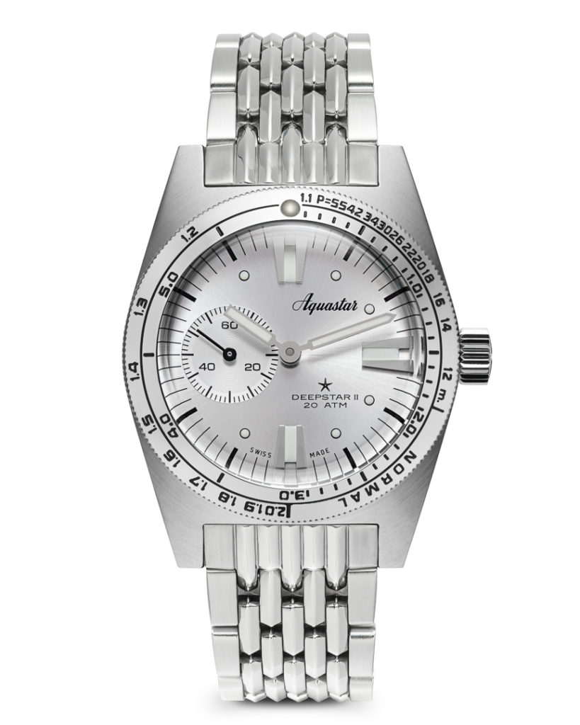 The Aquastar Deepstar II is an evolution of the Deepstar from 1963. It is what would have been the logical successor of the original. It retains the same case dimensions of the Original and relies on the same bezel patent. The unique and uncluttered mono sub counter dial, and the patented multiple dive decompression bezel table make the Deepstar an unmatched diver-oriented tool with an instantly recognizable design.