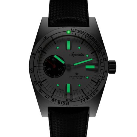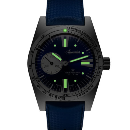 The Aquastar Deepstar II is the evolution of the original Deepstar from 1963, relying on the same patent of the original piece that enables calculating multiple dive and decompression times while housing a non-chronograph, easy to use 3 hand mechanism, and moderately sized 37mmX46mm for great comfort of wear.  Being a result of recreation of one of the most influential dive watches of the 60s, the unique and uncluttered mono sub dial, and the patented multiple dive decompression bezel table make the Deepstar an unmatched diver-oriented tool with an instantly recognizable design.