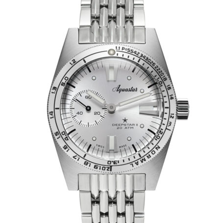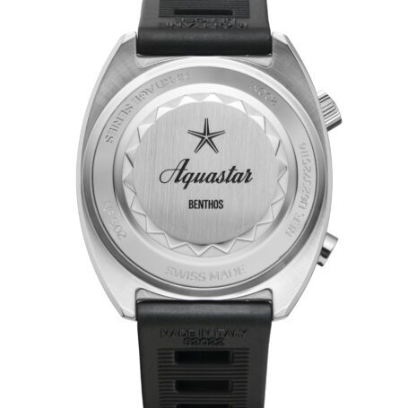 Housed in an eminently wearable 37mm stainless steel case, the new Deepstar II retains the function-first ethos and proportions of the pioneering Deepstar Chronograph from 1962, as well as two of Aquastar’s key identifiers: the rotating timing bezel bearing the brand’s own “no decompression” table used to time repeated dives (the first and only of its kind). It also features the emblematic “cyclops” style mono-compax counter originally devised by Aquastar founder and innovator Frederic Robert. Unique to the Deepstar II, this detail now houses the running seconds register at 9:00. Like the Deepstar Chronograph, the Deepstar II bears 200 meters of water resistance, and is powered by a top-grade Swiss-made automatic movement.