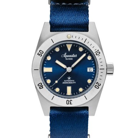 DIAL: New Steel Blue dial High density filling old light Radium super Luminova application in applied indices Re-edition of the Aquastar model 60 from 1957CASE: Bidirectional rotating bezel on a ceramic bearing 316L Stainless Steel case with highly domed, AR triple coated sapphire crystal Case Diameter                 37mm Bezel Diameter                 37mm Length from lug to lug     47mm Case height                      11mmMOVEMENT: Elabore Grade genuine ETA 2824-2 Physical Dimensions Ø25.6 mm x 4.60 mm Frequency 4 Hz Power reserve 38h Reassembly Clockwise (bi-directional) automatic Number of rubies 25 Country of Manufacture: Switzerland, Swiss madeFUNCTIONS: Hour, minute and seconds indicators Bi-directional Rotating 60-minute elapsed time bezel on ceramic ball bearingSTRAP/BRACELET: Stainless Steel BOR Bracelet with fitted Endlinks + Genuine Blue TROPIC strap  + Seatbelt NATO Strap, all 3 are included in this promotional package.